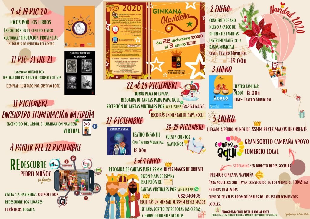 De este modo, surgen una serie de iniciativas para disfrutar de la Navidad en familia, como las rutas por nuestros recursos turísticos, donde los participantes serán obsequiados con un pequeño detalle. También se pondrán en marcha los habituales concursos de belenes, árboles y escaparates que buscan incentivar la decoración y contribuir a generar un clima especial. Este año, como novedad, los premios de los concursos tendrán forma de vale que se podrá canjear en los bares y restaurantes de Pedro Muñoz. Una forma de colaborar y apoyar al sector de la hostelería pedroteña en unos tiempos de aforo limitado para adaptarse a la normativa sanitaria aplicada para controlar el número de contagios.